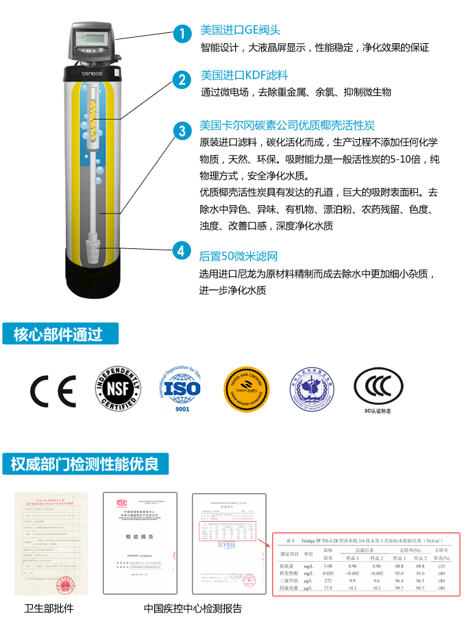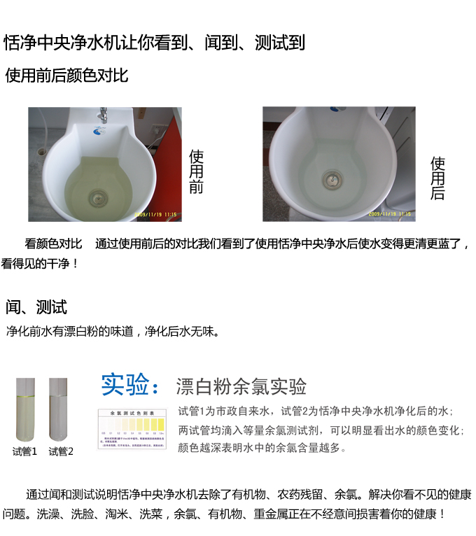 中央凈水機全自動垡頭有效去除水中的異色、異味;進一步濾除水中微小雜質(zhì)、膠狀體;去除水中的漂白粉余氯、農(nóng)藥、重金屬;保留對人體有益的礦物質(zhì)。使水變得碧清、碧藍,去除對人體有害的物質(zhì)。