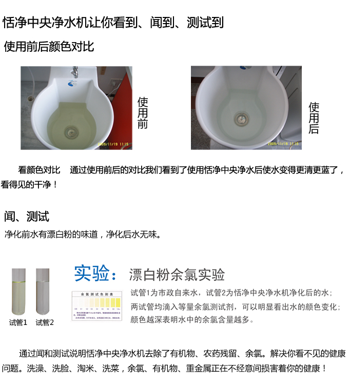 全屋中央凈水機(jī)有效去除水中的異色、異味;進(jìn)一步濾除水中微小雜質(zhì)、膠狀體;去除水中的漂白粉余氯、農(nóng)藥、重金屬;保留對人體有益的礦物質(zhì)。使水變得碧清、碧藍(lán),去除對人體有害的物質(zhì)。