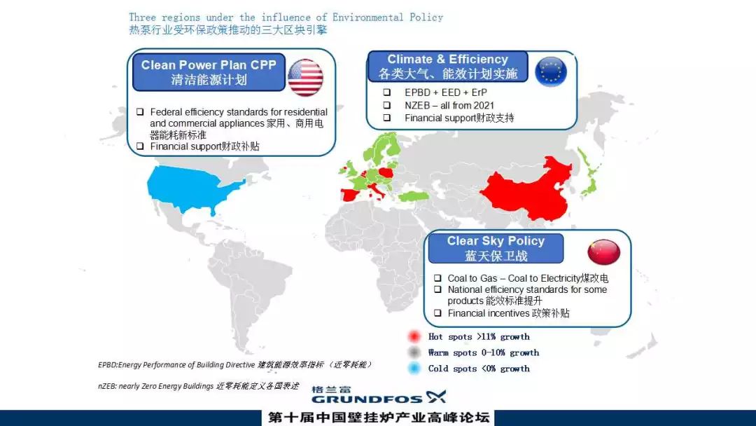 談到區(qū)域市場(chǎng)和熱泵行業(yè)的增速,全球有三大區(qū)塊受到推動(dòng),從左到右分別是美國、歐洲、中國。